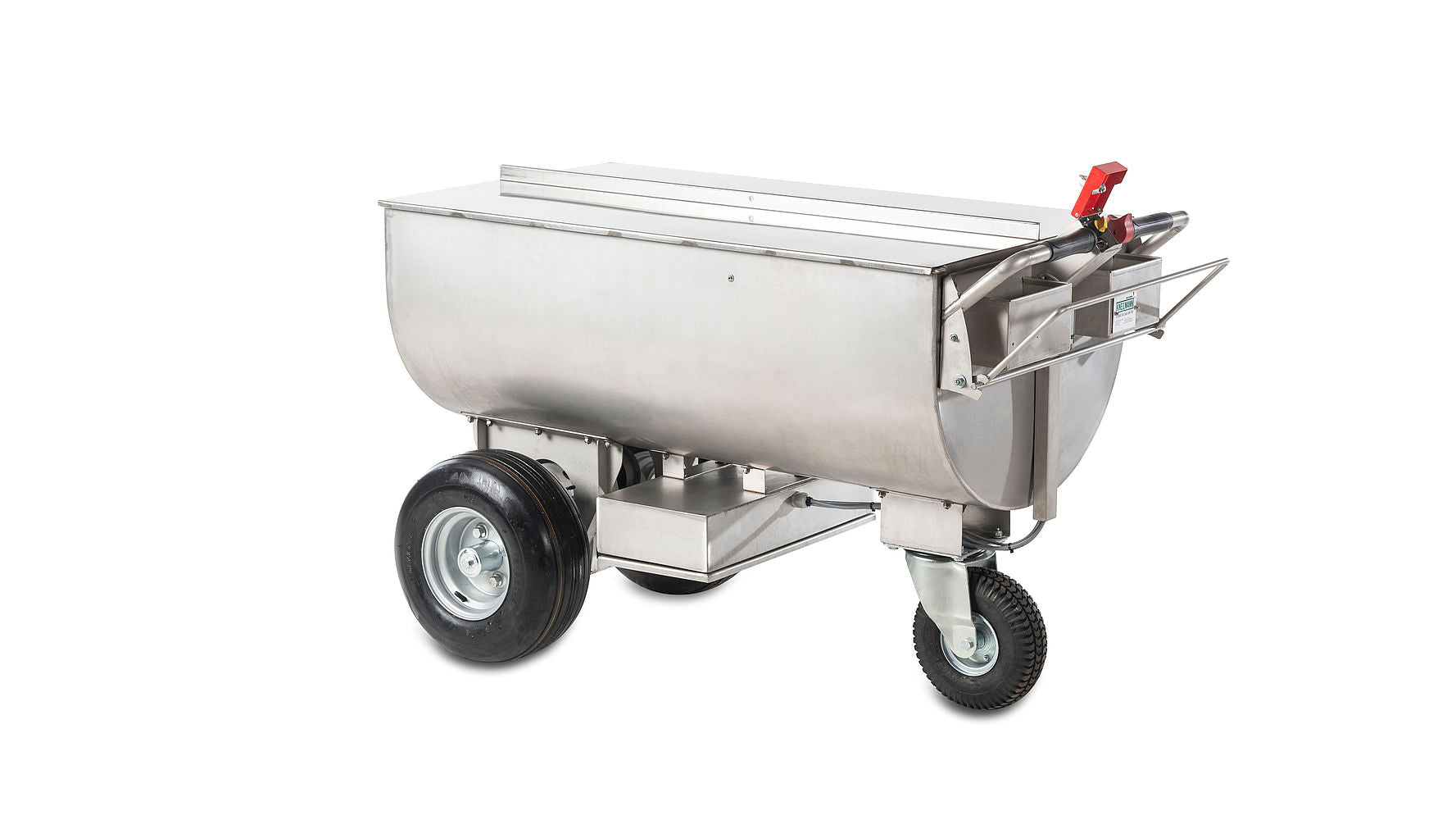 Der stabile Futterwagen aus Edelstahl mit seiner Trennwand, den Deckeln und dem Utensilien-Kasten wird schnell zum unentbehrlichen Helfer auf Hof und Gestüt. Durch die Anordnung der großvolumigen kugelgelagerten Räder ist er auch bei voller Beladung leicht zu schieben.
