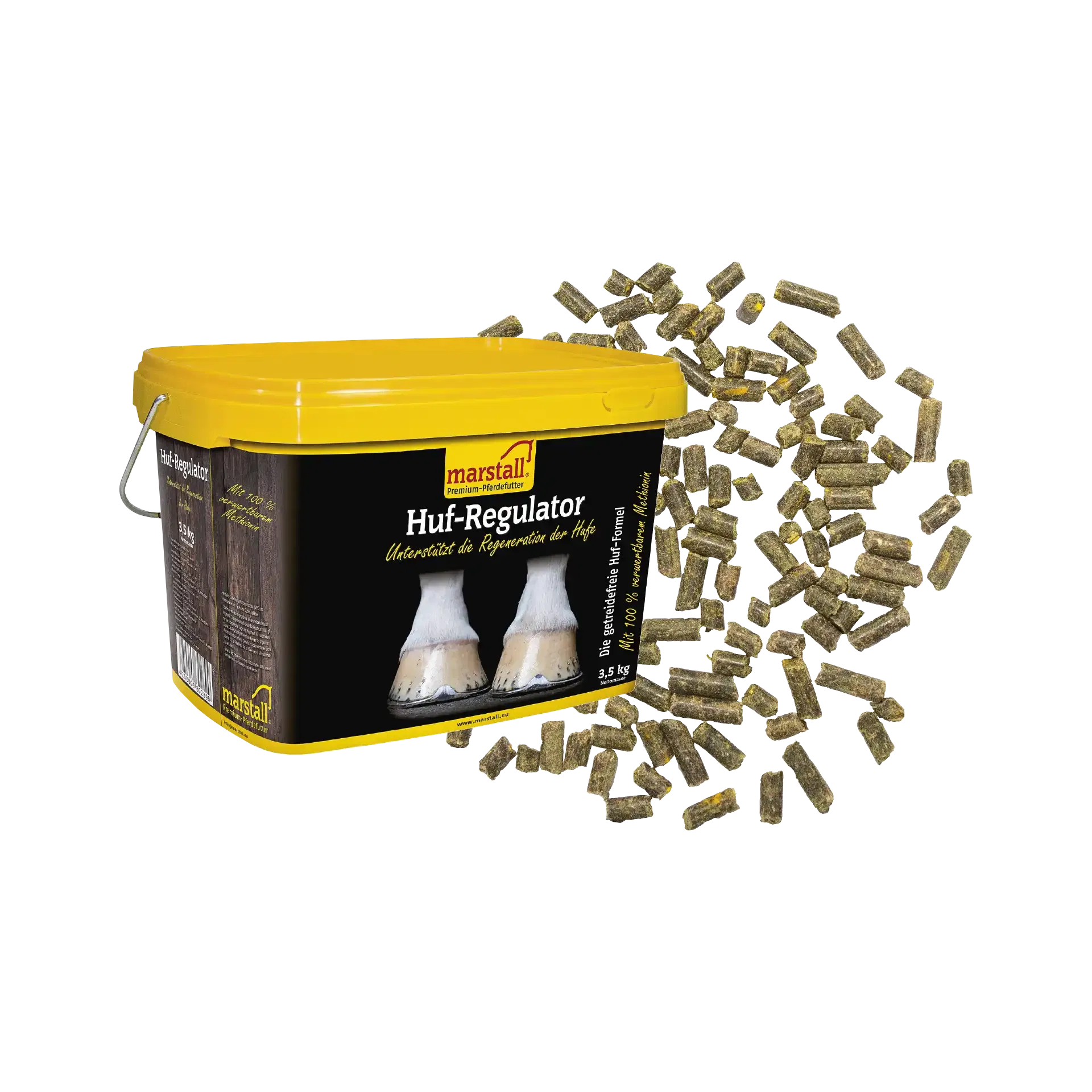 marstall Huf-Regulator enthält neben Biotin die für das Horn wertvollen Spurenelemente Kupfer und Zink in organischer Form. Die schwefelhaltige Aminosäure Methionin, Kurkuma und Kieselgur sind weitere Komponenten.
