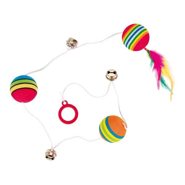 Dieses Katzenspielzeug des Herstellers Trixie besteht aus drei Rainbow-Bällen aus Schaumstoff und drei Glöckchen, die an einem Gummiband befestigt sind.